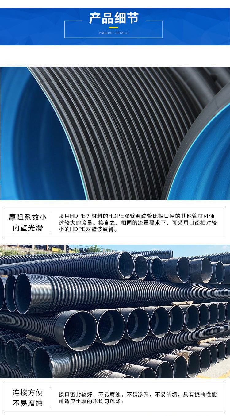 HDPE排水波紋管是一種具有耐壓、抗沖擊、抗腐蝕、透水性能好、使用壽命長等優點的管材,常用于市政排水、雨水、高速公路排水、建筑給排水等領域。